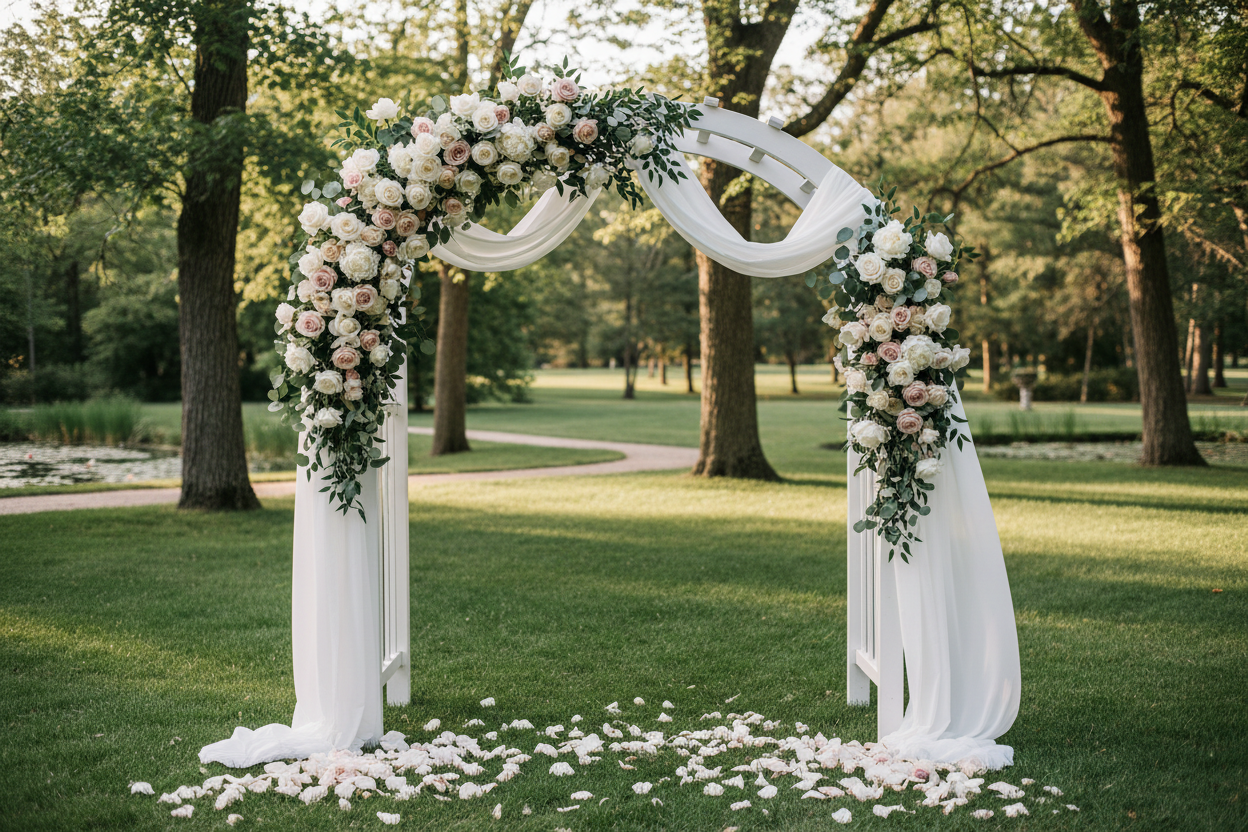 針對草地、沙灘等室外場景,拱門設計融入自然韻味,選用耐風、防水、耐鮮的花材或絲花,搭配輕盈紗幔或藤條,打造清新自然的風格。草地婚禮的綠意與花拱相映成趣,沙灘婚禮的簡潔花拱與海風呼應,既抵禦戶外環境影響,又能成為攝影出片的核心場景,讓新人在自然光影中,開啟幸福篇章。