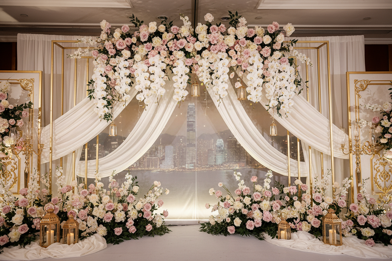 Wedding backdrop 與 Floral backdrop 是婚禮的核心視覺重點,更是定格幸福瞬間的關鍵場景,二者既相互呼應,又各具特色。Lavish Florist 依據婚禮主題、色調與場地屬性,為新人定制專属背景佈置。Wedding backdrop 側重整體氛圍營造,融合鮮花、高質感紗幔、定製燈光、水晶或絲花等元素,打造立體層次豐富的造型,可作為新人交換誓詞、合影留念的核心背景,無論是華麗莊重的宴會廳場景,還是清新自然的草地婚禮,都能完美契合場地風格,強化婚禮的儀式感。